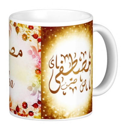 Mug avec le prénom "Mustapha" écrit en français, en arabe (مصطفى) et calligraphié de façon artistique en arabe sur la partie droite.
