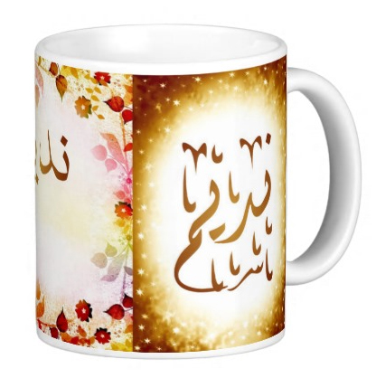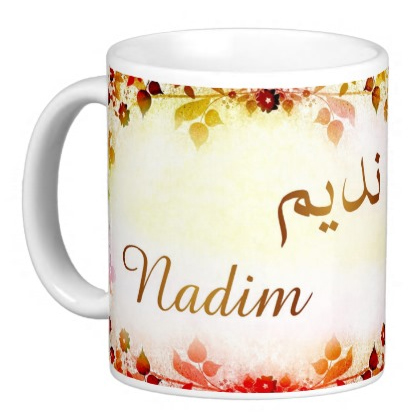 Mug avec le prénom "Nadim" écrit en français, en arabe (نديم) et calligraphié de façon artistique en arabe sur la partie droite.