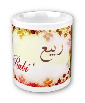 Mug avec le prénom Rabî' calligraphié en arabe (ربيع) ainsi que son épellation lettre par lettre en arabe.