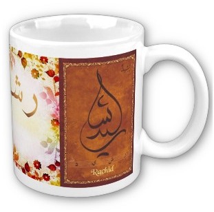 Mug avec le prénom "Rachid" calligraphié en arabe (رشيد) ainsi que son épellation lettre par lettre en arabe.