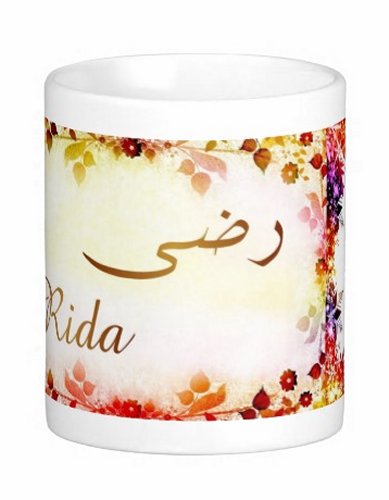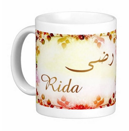 Mug avec le prénom "Rida" écrit en français, en arabe (رضى) et calligraphié de façon artistique en arabe sur la partie droite.