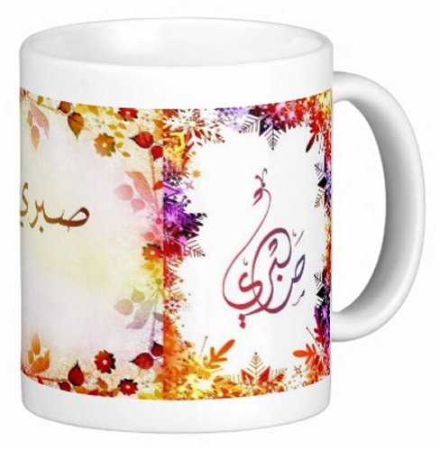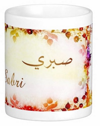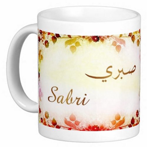 Mug avec le prénom "Sabri" écrit en français, en arabe (صبري) et calligraphié de façon artistique en arabe sur la partie droite.