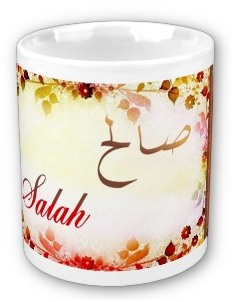 Mug avec le prénom "Salah" calligraphié en arabe (صالح) ainsi que son épellation lettre par lettre en arabe.