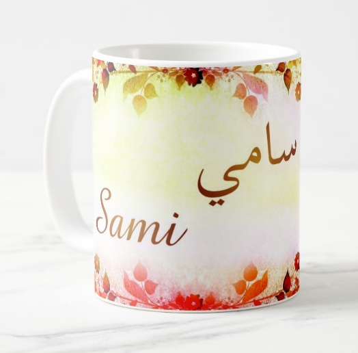 Mug avec le prénom Sami calligraphié en arabe ainsi que son écriture normale en arabe (سامي) et en français.