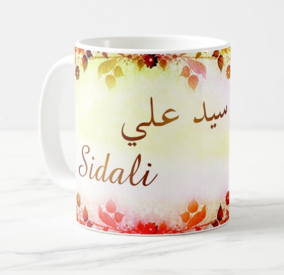 Mug avec le prénom Sidali calligraphié en arabe ainsi que son écriture normale en arabe (سيدعلي) et en français.