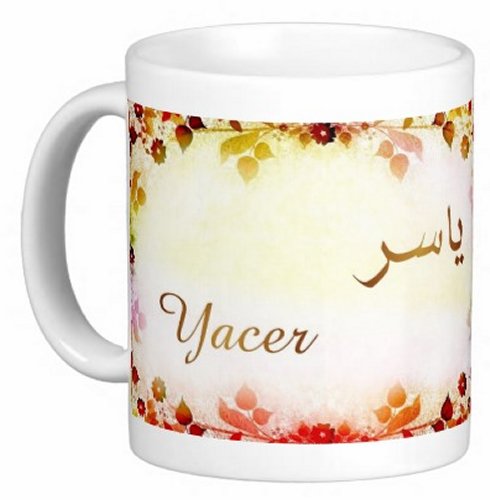 Mug avec le prénom "Yacer" écrit en français, en arabe (ياسر) et calligraphié de façon artistique en arabe sur la partie droite.