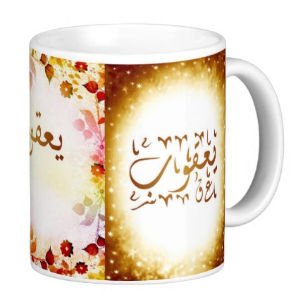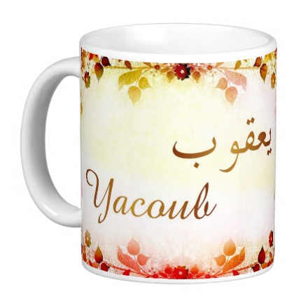 Mug avec le prénom "Yacoub" écrit en français, en arabe (يعقوب) et calligraphié de façon artistique en arabe sur la partie droite.