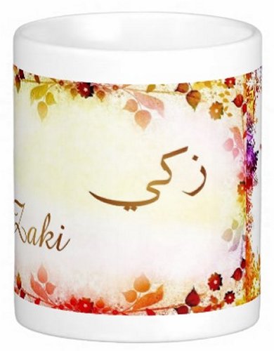 Mug avec le prénom "Zaki" écrit en français, en arabe (زكي) et calligraphié de façon artistique en arabe sur la partie droite.