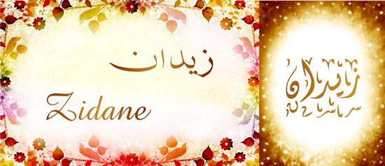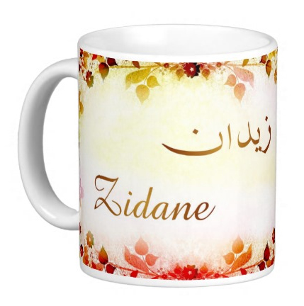 Mug avec le prénom "Zaydane" écrit en français, en arabe (زيدان) et calligraphié de façon artistique en arabe sur la partie droite.