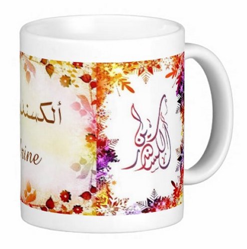 Mug avec le prénom "Alexandrine" écrit en français, en arabe (ألكسندرين) et calligraphié de façon artistique en arabe sur la partie droite.