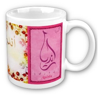 Mug avec le prénom "Andréa" calligraphié en arabe (اندريا) ainsi que son épellation lettre par lettre en arabe.