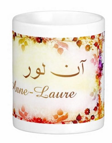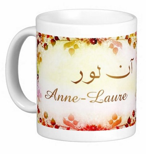 Mug avec le prénom "Anne-Laure" écrit en français, en arabe (آن لور) et calligraphié de façon artistique en arabe sur la partie droite.