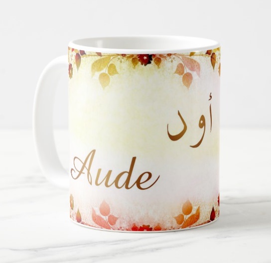 Mug avec le prénom "Aude" écrit en français, en arabe (أود) et calligraphié de façon artistique en arabe sur la partie droite.