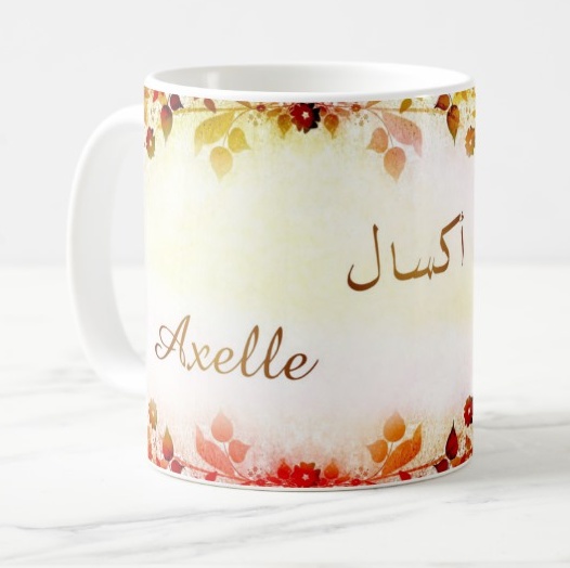Mug avec le prénom "Axelle" écrit en français, en arabe (أكسال) et calligraphié de façon artistique en arabe sur la partie droite.