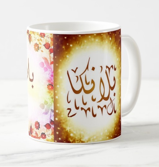 Mug avec le prénom Blanca calligraphié en arabe ainsi que son écriture normale en arabe (بلانكا) et en français.