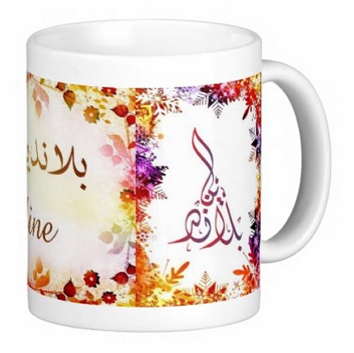 Mug avec le prénom "Blandine" écrit en français, en arabe (بلاندين) et calligraphié de façon artistique en arabe sur la partie droite.