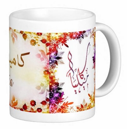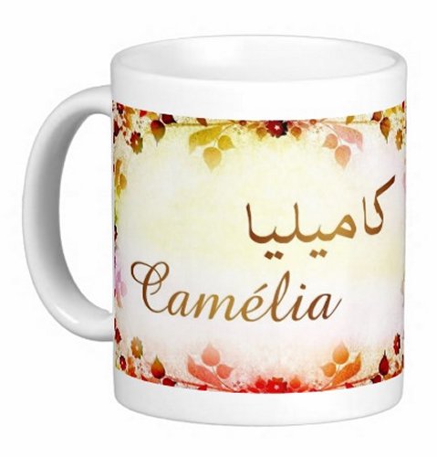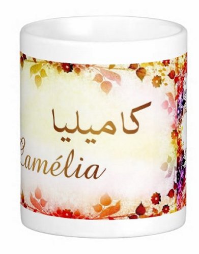 Mug avec le prénom "Camélia" écrit en français, en arabe (كاميليا) et calligraphié de façon artistique en arabe sur la partie droite.