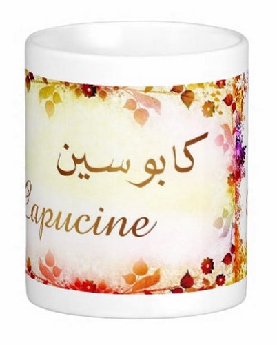 Mug avec le prénom "Capucine" écrit en français, en arabe (كابوسين) et calligraphié de façon artistique en arabe sur la partie droite.