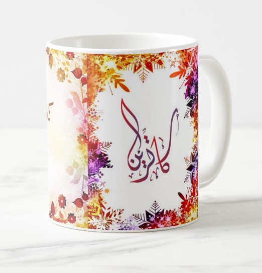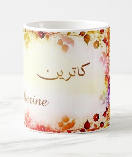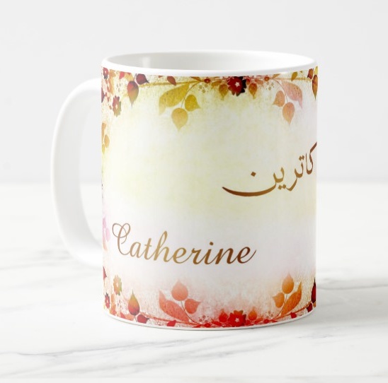 Mug avec le prénom Catherine calligraphié en arabe ainsi que son écriture normale en arabe (كاترين) et en français.