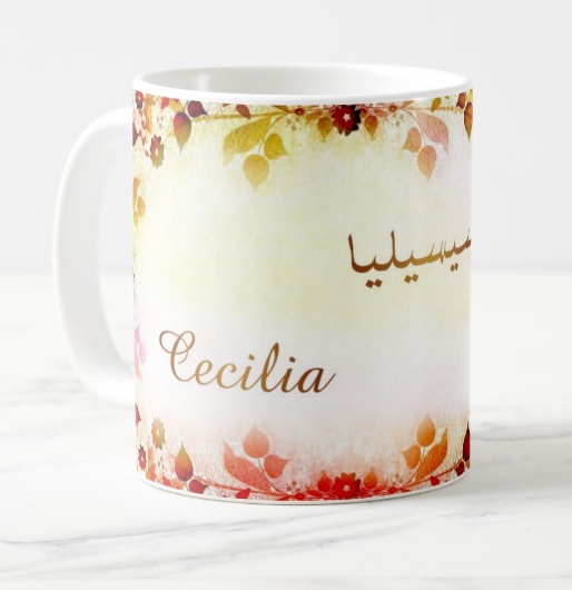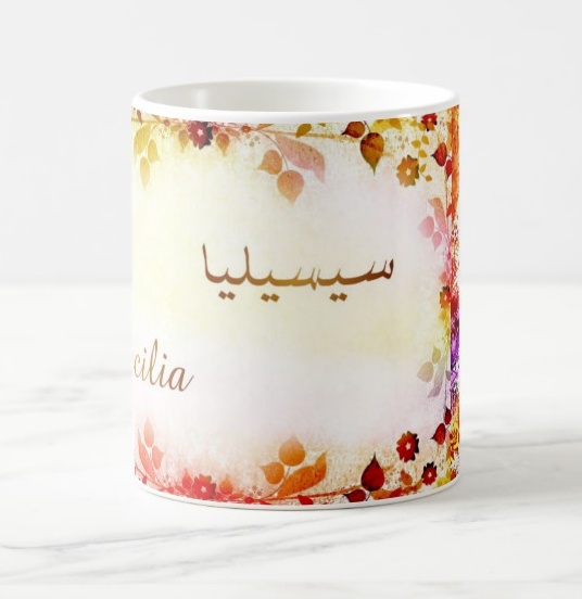 Mug avec le prénom Cecilia calligraphié en arabe ainsi que son écriture normale en arabe (سيسيليا) et en français.
