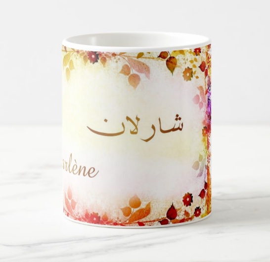 Mug avec le prénom Charlène calligraphié en arabe ainsi que son écriture normale en arabe (شارلان) et en français.