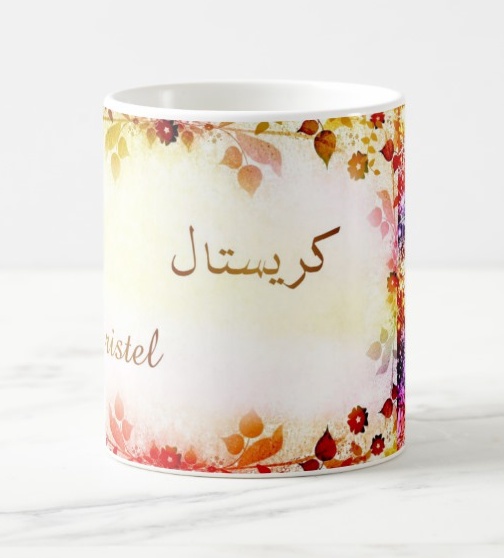 Mug avec le prénom Christel calligraphié en arabe ainsi que son écriture normale en arabe (كريستال) et en français.