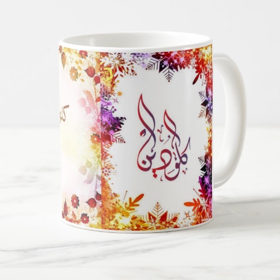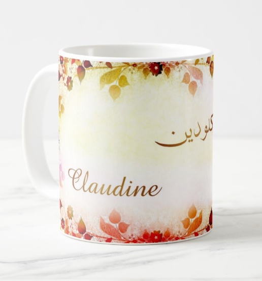 Mug avec le prénom Claudine calligraphié en arabe ainsi que son écriture normale en arabe (كلودين) et en français.