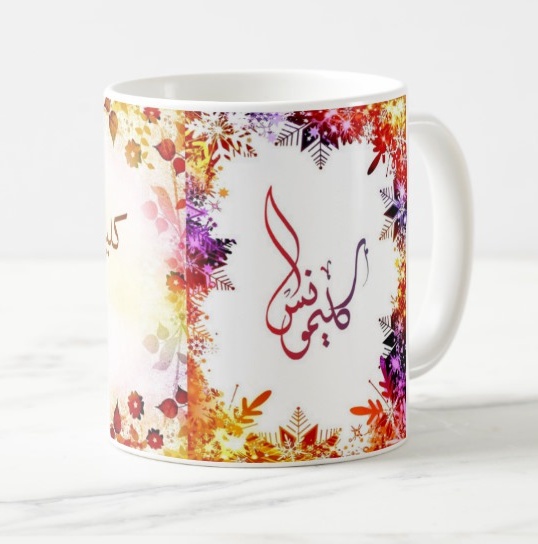 Mug avec le prénom Clémence calligraphié en arabe ainsi que son écriture normale en arabe (كليمونس) et en français.