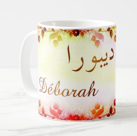 Mug avec le prénom Déborah calligraphié en arabe ainsi que son écriture normale en arabe (ديبورا) et en français.