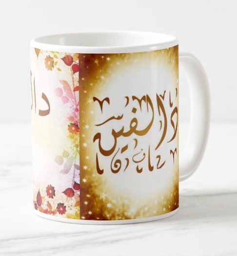 Mug avec le prénom Delphine calligraphié en arabe ainsi que son écriture normale en arabe (دالفين) et en français.
