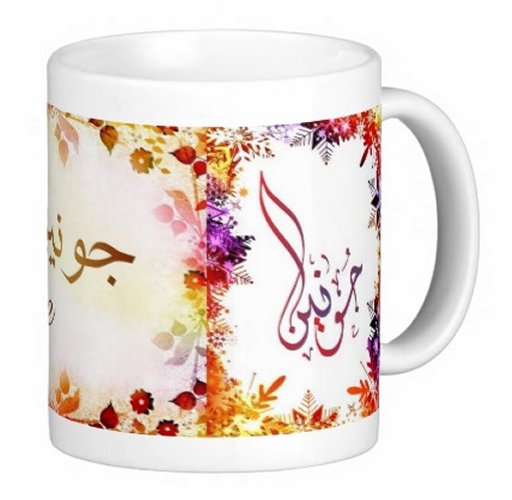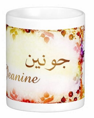 Mug avec le prénom "Jeanine" écrit en français, en arabe (جونين) et calligraphié de façon artistique en arabe sur la partie droite.