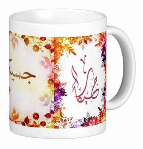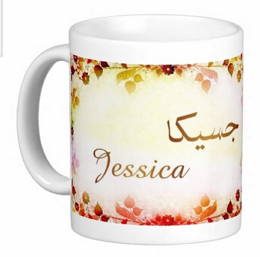 Mug avec le prénom "Jessica" écrit en français, en arabe (جسيكا) et calligraphié de façon artistique en arabe sur la partie droite.
