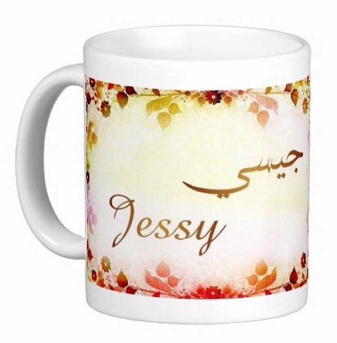 Mug avec le prénom "Jessy" écrit en français, en arabe (جيسي) et calligraphié de façon artistique en arabe sur la partie droite.