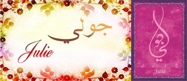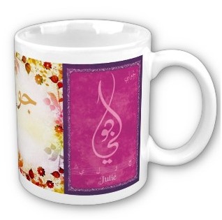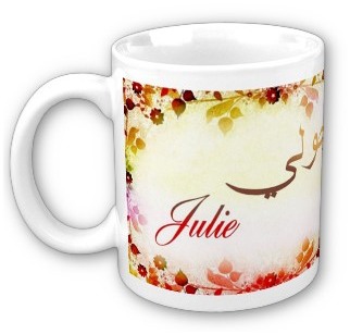 Mug avec le prénom "Julie" calligraphié en arabe (جولي) ainsi que son épellation lettre par lettre en arabe.