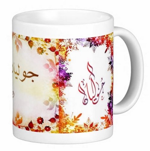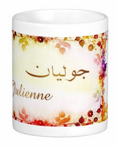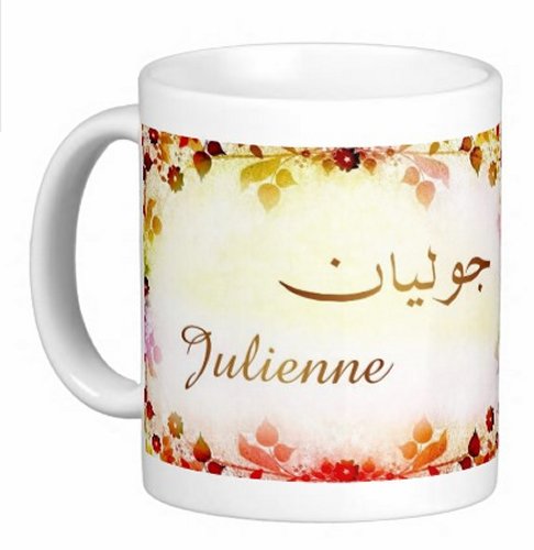 Mug avec le prénom "Julienne" écrit en français, en arabe (جوليان) et calligraphié de façon artistique en arabe sur la partie droite.