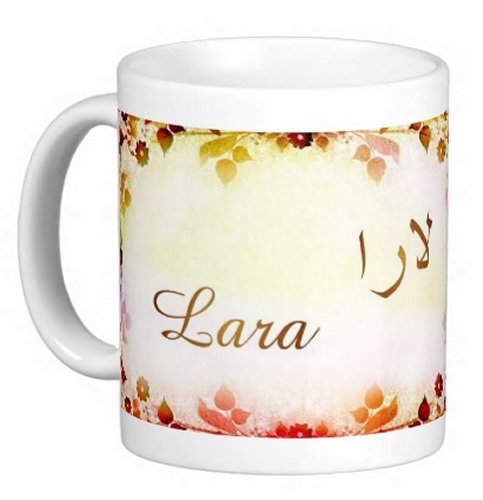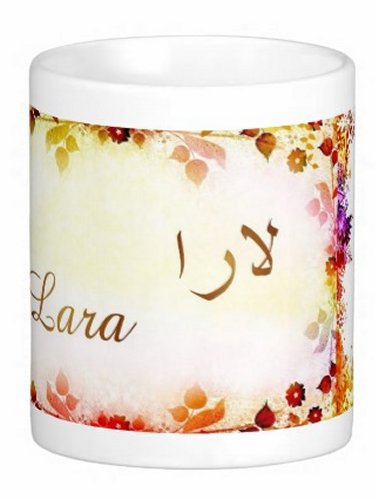 Mug avec le prénom "Lara" écrit en français, en arabe (لارا) et calligraphié de façon artistique en arabe sur la partie droite.
