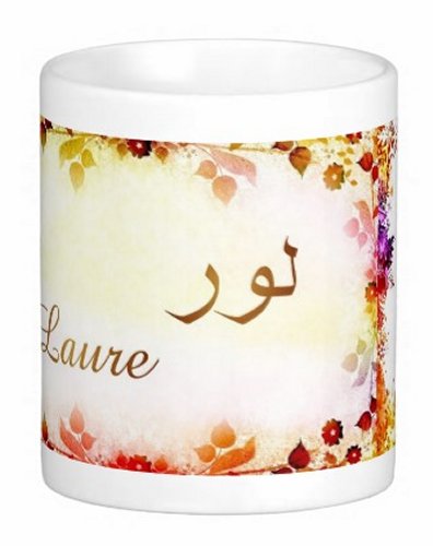 Mug avec le prénom "Laure" écrit en français, en arabe (لور) et calligraphié de façon artistique en arabe sur la partie droite.