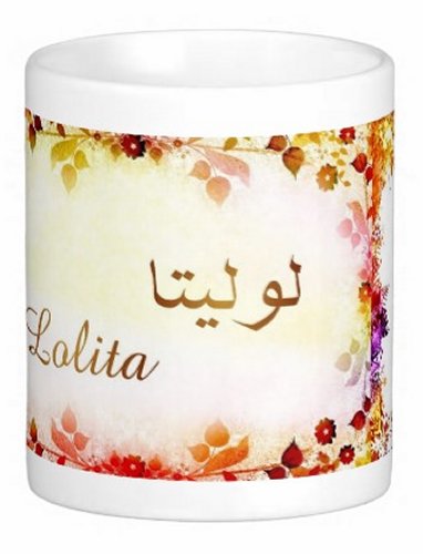 Mug avec le prénom "Lolita" écrit en français, en arabe (لوليتا) et calligraphié de façon artistique en arabe sur la partie droite.