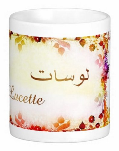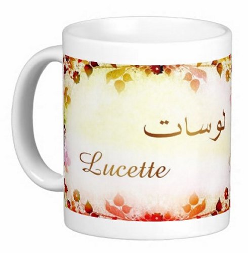 Mug avec le prénom "Lucette" écrit en français, en arabe (لوسات) et calligraphié de façon artistique en arabe sur la partie droite.