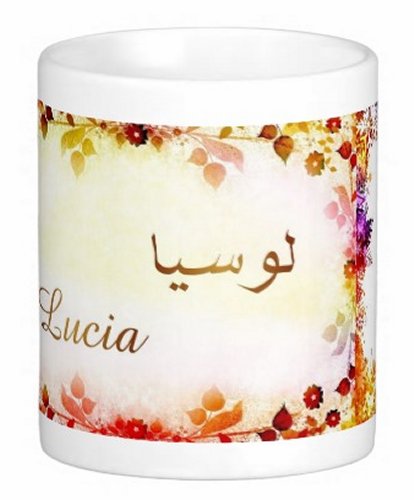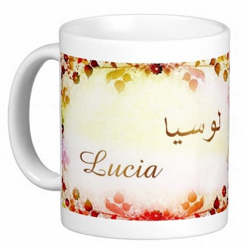 Mug avec le prénom "Lucia" écrit en français, en arabe (لوسيا) et calligraphié de façon artistique en arabe sur la partie droite.