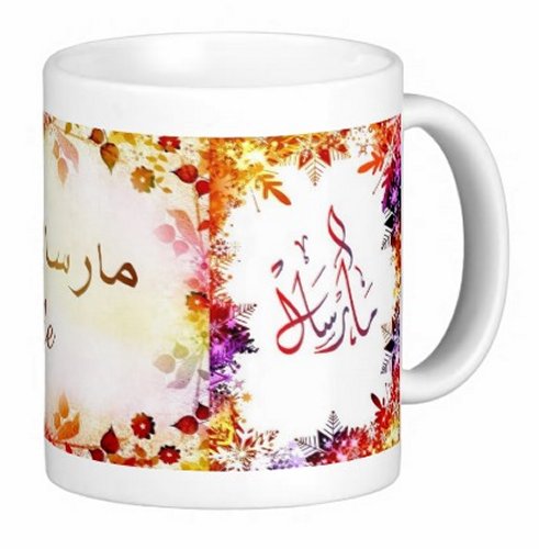 Mug avec le prénom "Marcelle" écrit en français, en arabe (مارسال) et calligraphié de façon artistique en arabe sur la partie droite.
