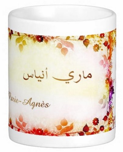 Mug avec le prénom "Marie-Agnès" écrit en français, en arabe (ماري أنياس) et calligraphié de façon artistique en arabe sur la partie droite.