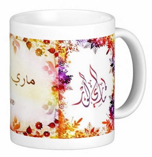 Mug avec le prénom "Marie-Laure" écrit en français, en arabe (ماري لور) et calligraphié de façon artistique en arabe sur la partie droite.