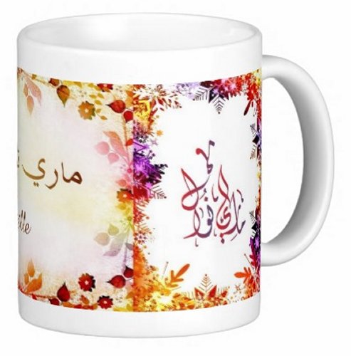 Mug avec le prénom "Marie-Noëlle" écrit en français, en arabe (ماري نوال) et calligraphié de façon artistique en arabe sur la partie droite.