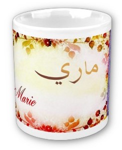 Mug avec le prénom "Marie" calligraphié en arabe (ماري) ainsi que son épellation lettre par lettre en arabe.