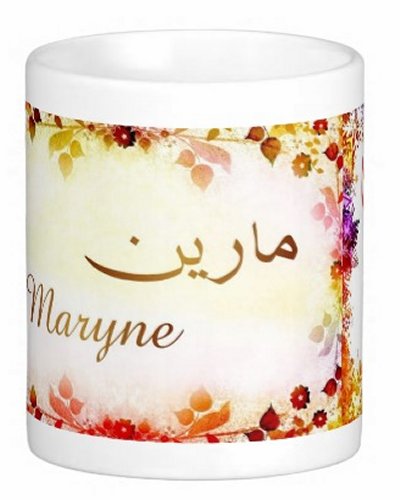 Mug avec le prénom "Maryne" écrit en français, en arabe (مارين) et calligraphié de façon artistique en arabe sur la partie droite.