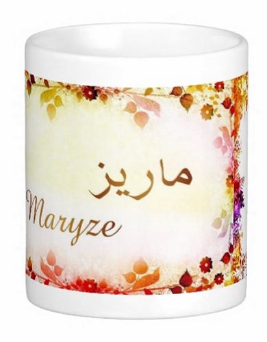 Mug avec le prénom "Maryze" écrit en français, en arabe (ماريز) et calligraphié de façon artistique en arabe sur la partie droite.