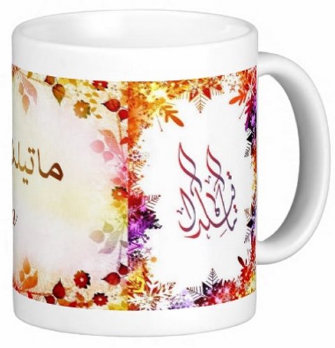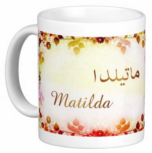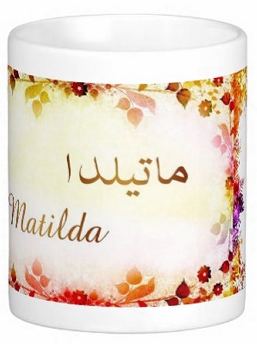Mug avec le prénom "Matilda" écrit en français, en arabe (ماتيلدا) et calligraphié de façon artistique en arabe sur la partie droite.