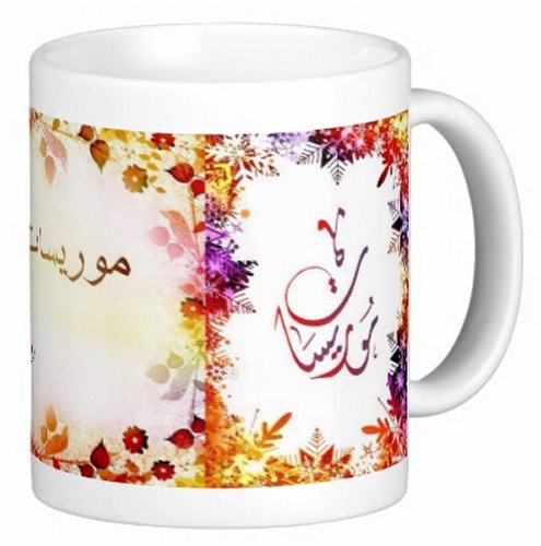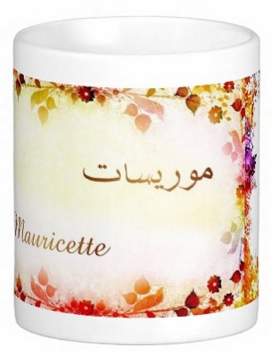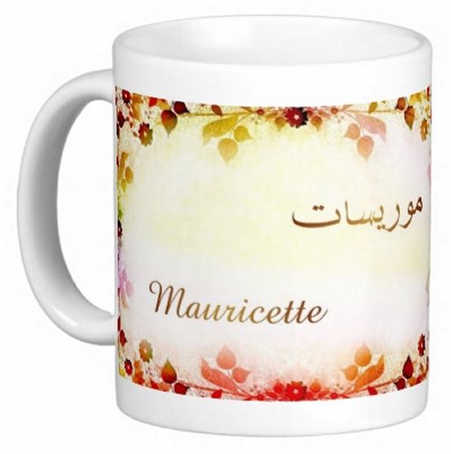 Mug avec le prénom "Mauricette" écrit en français, en arabe (موريسات) et calligraphié de façon artistique en arabe sur la partie droite.