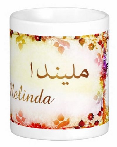 Mug avec le prénom "Melinda" écrit en français, en arabe (مليندا) et calligraphié de façon artistique en arabe sur la partie droite.